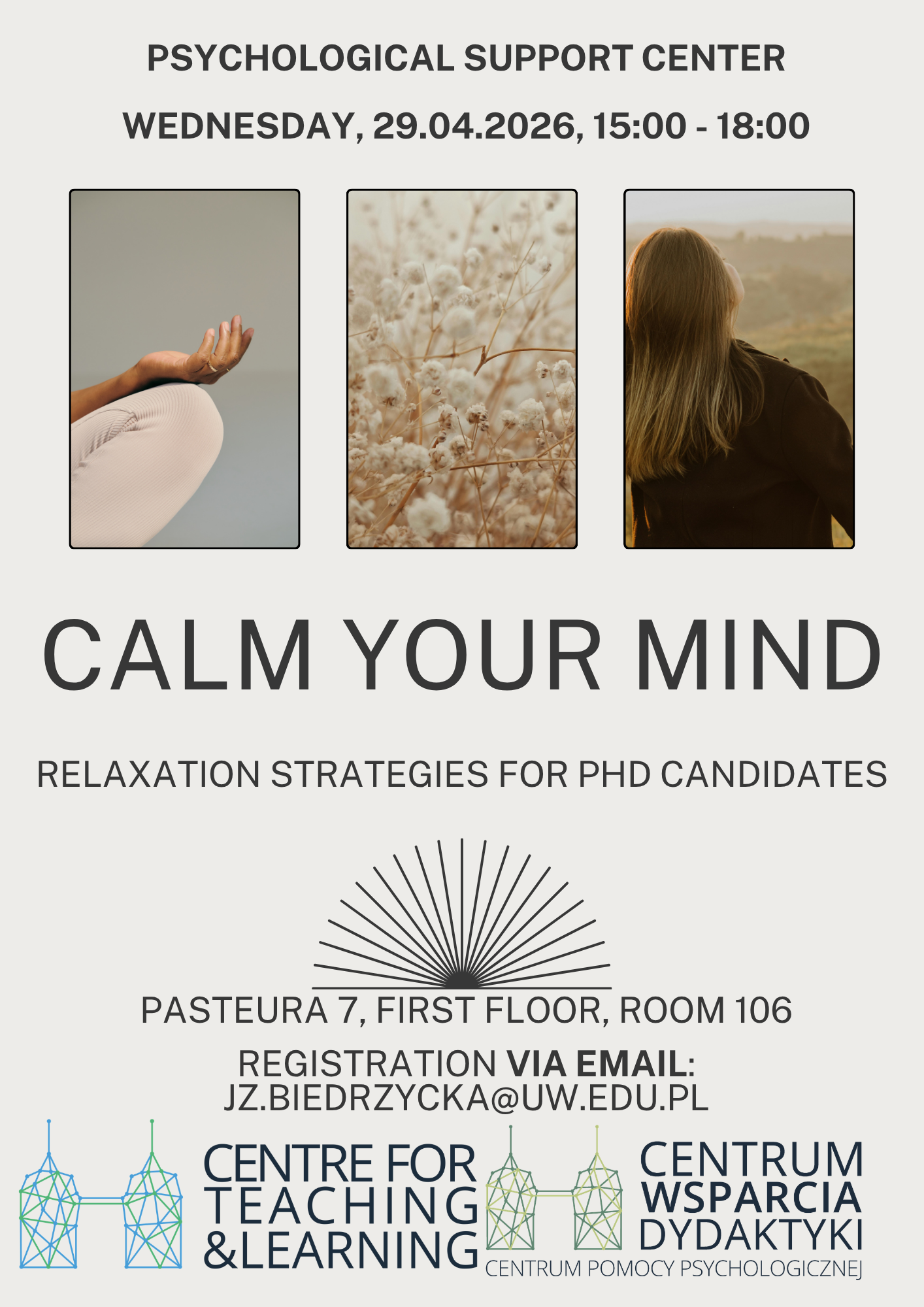 How to sign up? At Psychological Counseling Center at Pasteura 7 or by e-mail: jz.biedrzycka@uw.edu.pl